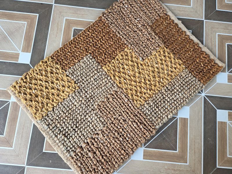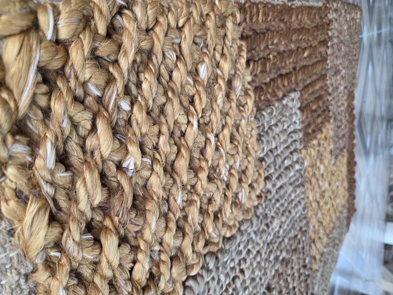 This beaytifully handcrafted jute rug showcases a patchwork of distinct weaving patterns and earthy tones, blending rustic charm with contemporary style. Made entirely from eco-friendly, biodegradable jute fibers, each section features a unique texture-from tight braids to loose, chunky weavers-in shades of natural beige, honey gold, and warm brown. The rug is durable and vesatile, perfect for entryways, living rooms, or any space needing a touch of natural elegance and artisanal craftsmanship .The combination of textures adds visual interest and a tactile experience underfoot, making it both functional and decorative.